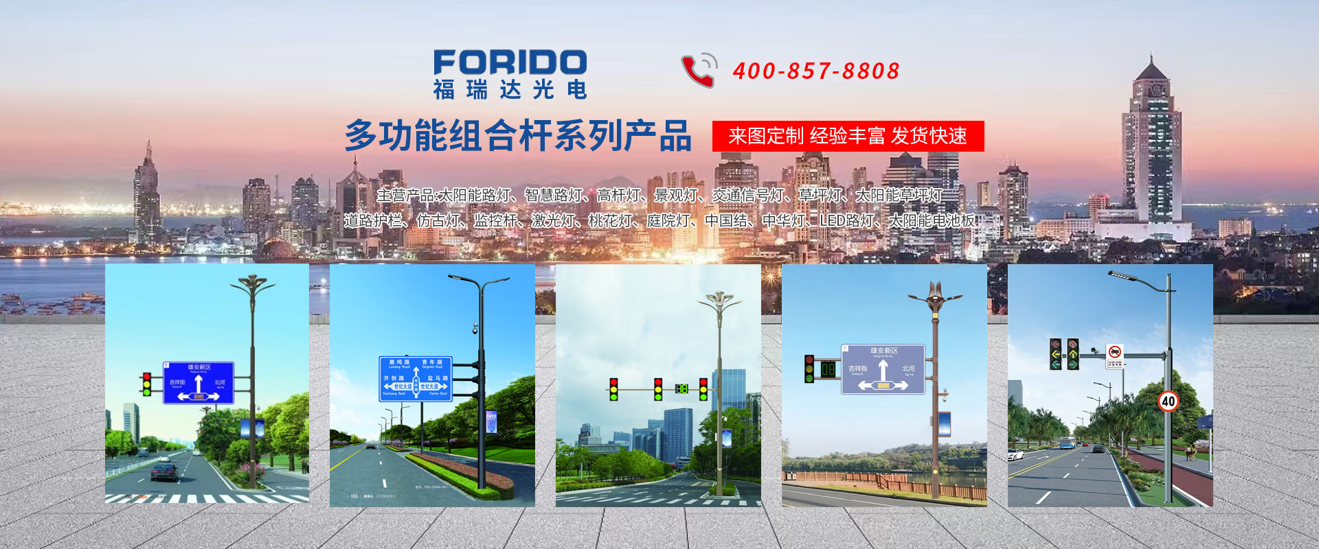 揚(yáng)州福瑞達(dá)光電科技有限公司位于淮左名都?xì)v史文化名城、中國路燈制造基地?fù)P州市北郊菱塘工業(yè)園,公司占地面積76000平方米,注冊資金10518萬元,擁有高級技術(shù)嫻熟的員工280多人,擁有大型折彎機(jī)、激光切割、數(shù)控注塑機(jī)、壓鑄機(jī)、自動埋弧焊、氣焊、彩色粉末靜電噴塑等大型自動化設(shè)備,我公司是一家集設(shè)計(jì)、研發(fā)、生產(chǎn)、銷售、施工安裝服務(wù)為一體的戶外交通照明產(chǎn)品制造商,主要生產(chǎn)智慧路燈、太陽能路燈、LED路燈、高桿燈、景觀燈、交通信號燈、交通標(biāo)志牌、通信鐵塔、路跨鋼結(jié)構(gòu)、公交站臺、太陽能光伏組件、景點(diǎn)亮化、樓宇亮化工程的設(shè)計(jì)施工等。公司秉承開拓創(chuàng)新、銳意進(jìn)取、精誠服務(wù)的企業(yè)精神,堅(jiān)持以“誠信為本、技術(shù)為先、服務(wù)是金”的合作理念,我們憑借先進(jìn)的制造工藝、優(yōu)質(zhì)的產(chǎn)品質(zhì)量、合理的市場價(jià)格和完善的售后服務(wù)贏得了廣闊的市場和客戶的信賴?! ∥夜疽淹ㄟ^ISO9001質(zhì)量體系認(rèn)證、ISO14001環(huán)境管理體認(rèn)證,CQC產(chǎn)品認(rèn)證,中國節(jié)能產(chǎn)品認(rèn)證,通過“CCC”強(qiáng)制性產(chǎn)品認(rèn)證,具有市政總承包,照明,交安,設(shè)計(jì)等資質(zhì)···